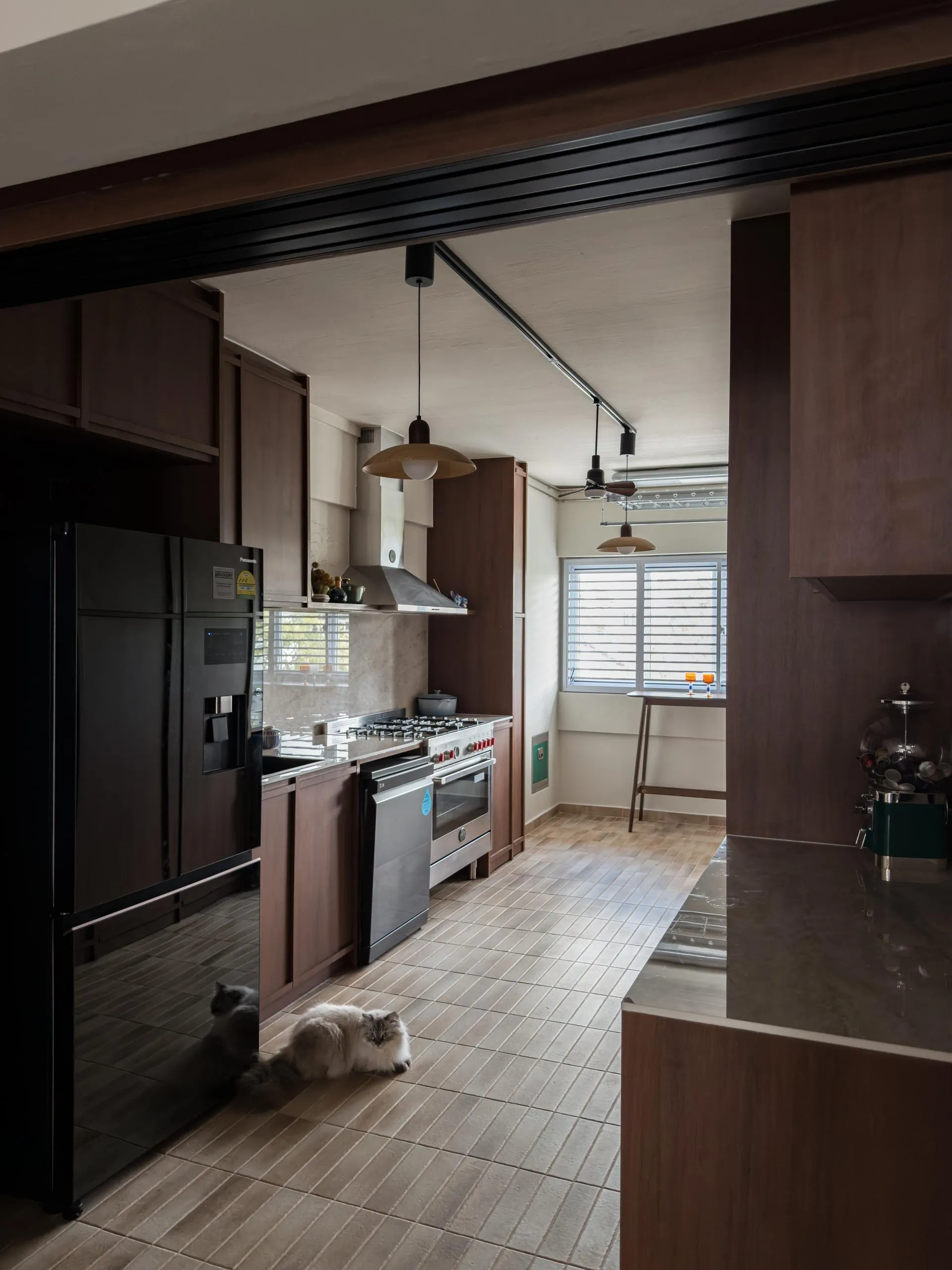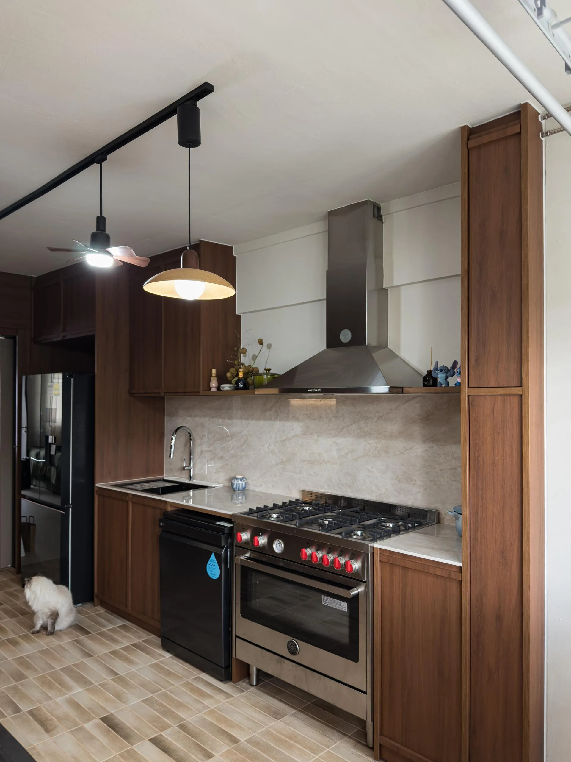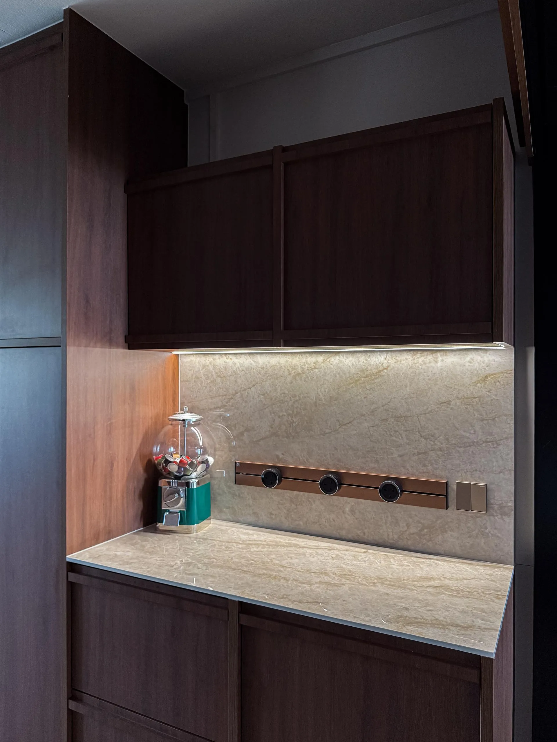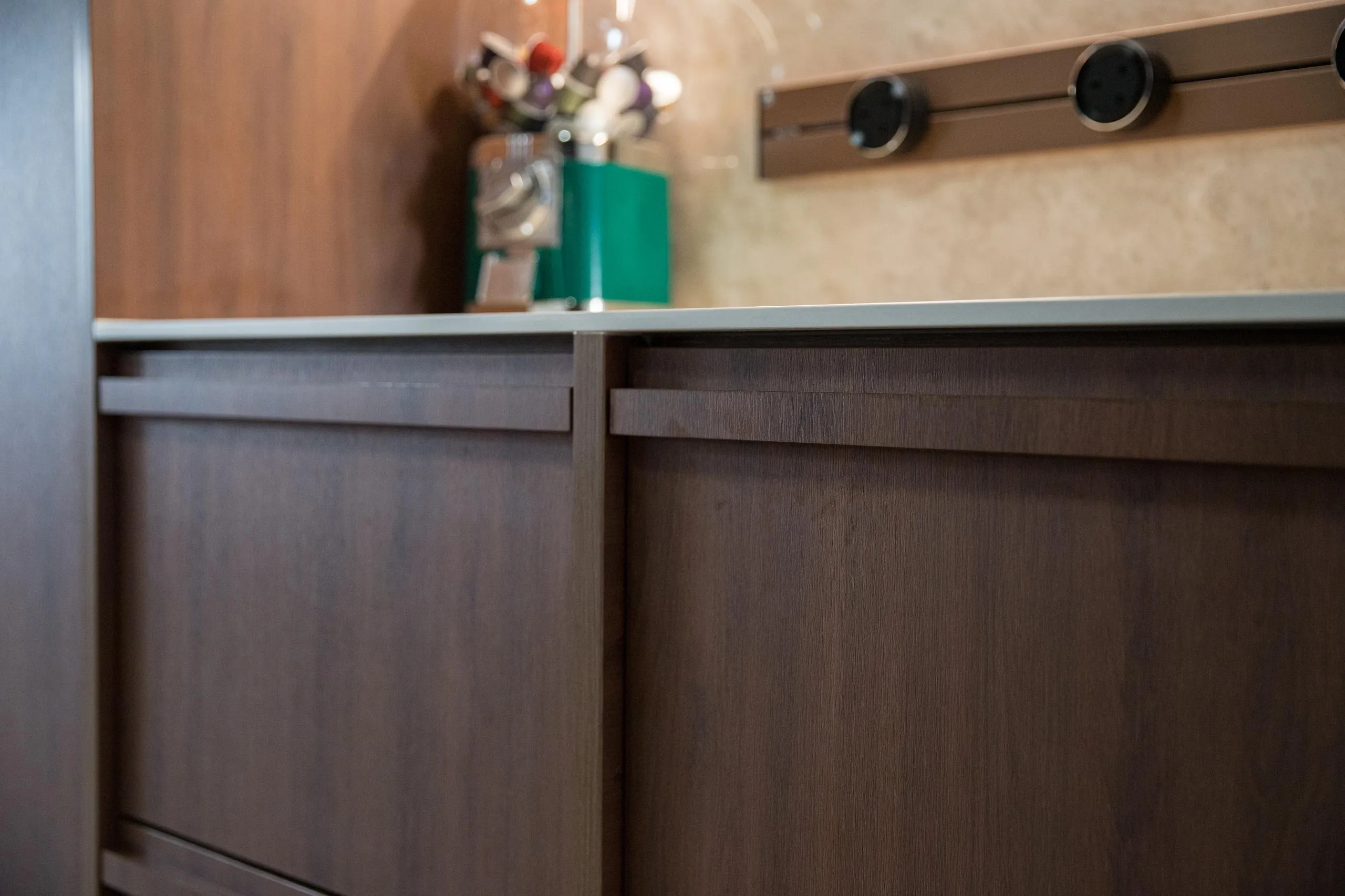 In the kitchen, full-height wood cabinets are custom-built to house built-in appliances, storage, and service areas within a tight galley layout. Accurate measurements and detailed fabrication ensure clean alignment, consistent panel gaps, and a flush finish throughout. The use of woodgrain finishes adds depth while maintaining long-term durability suitable for daily use.
