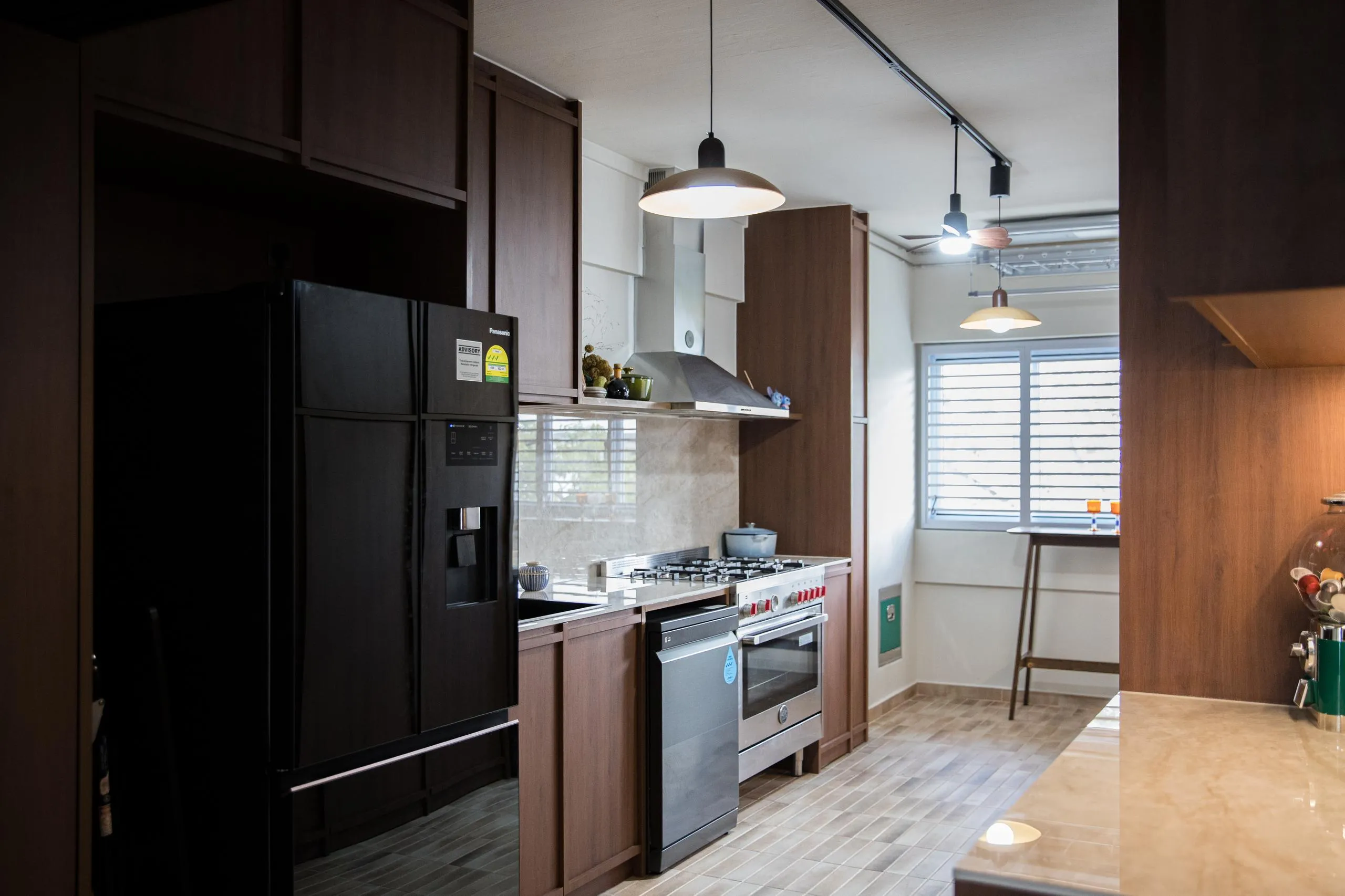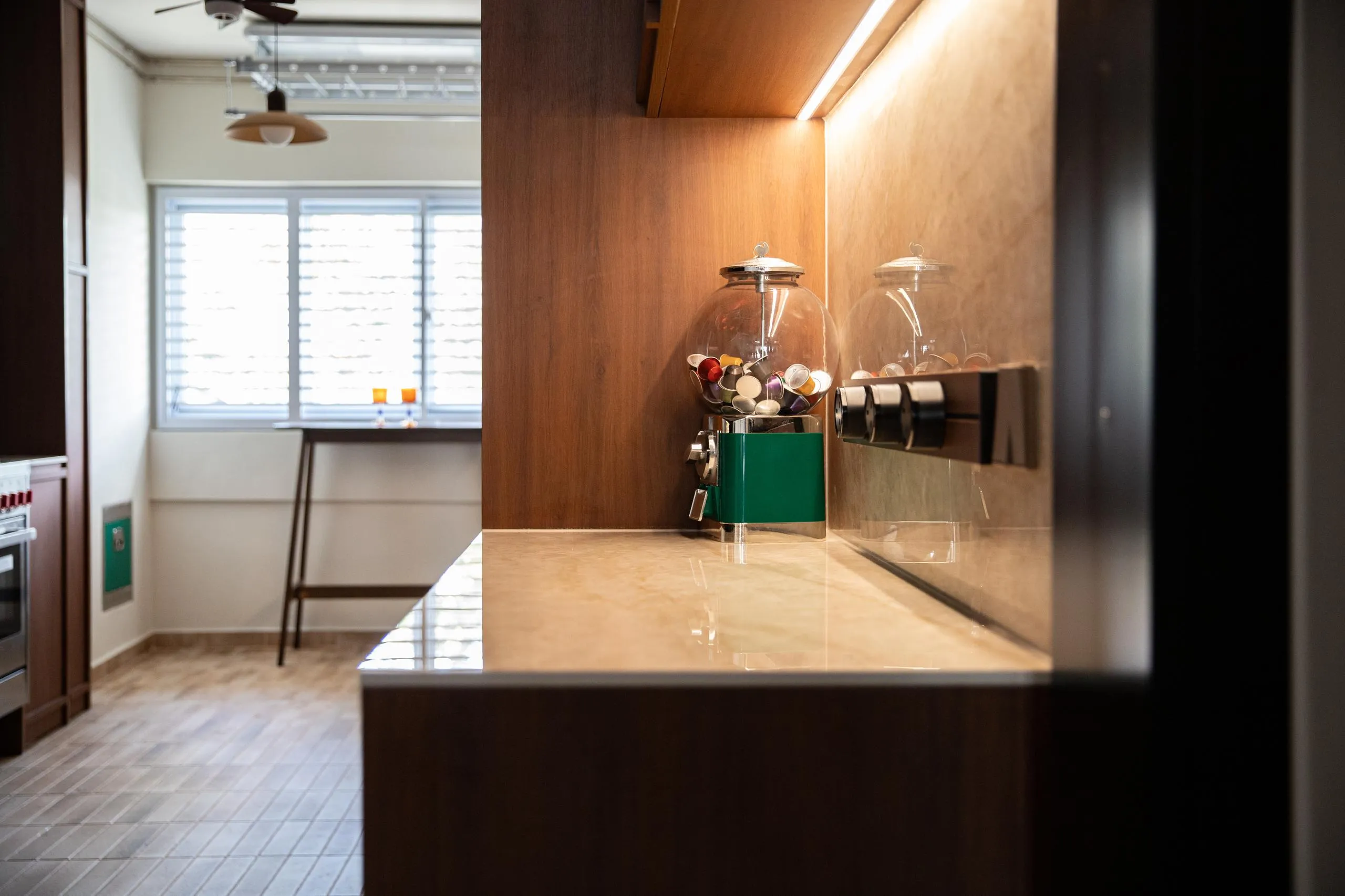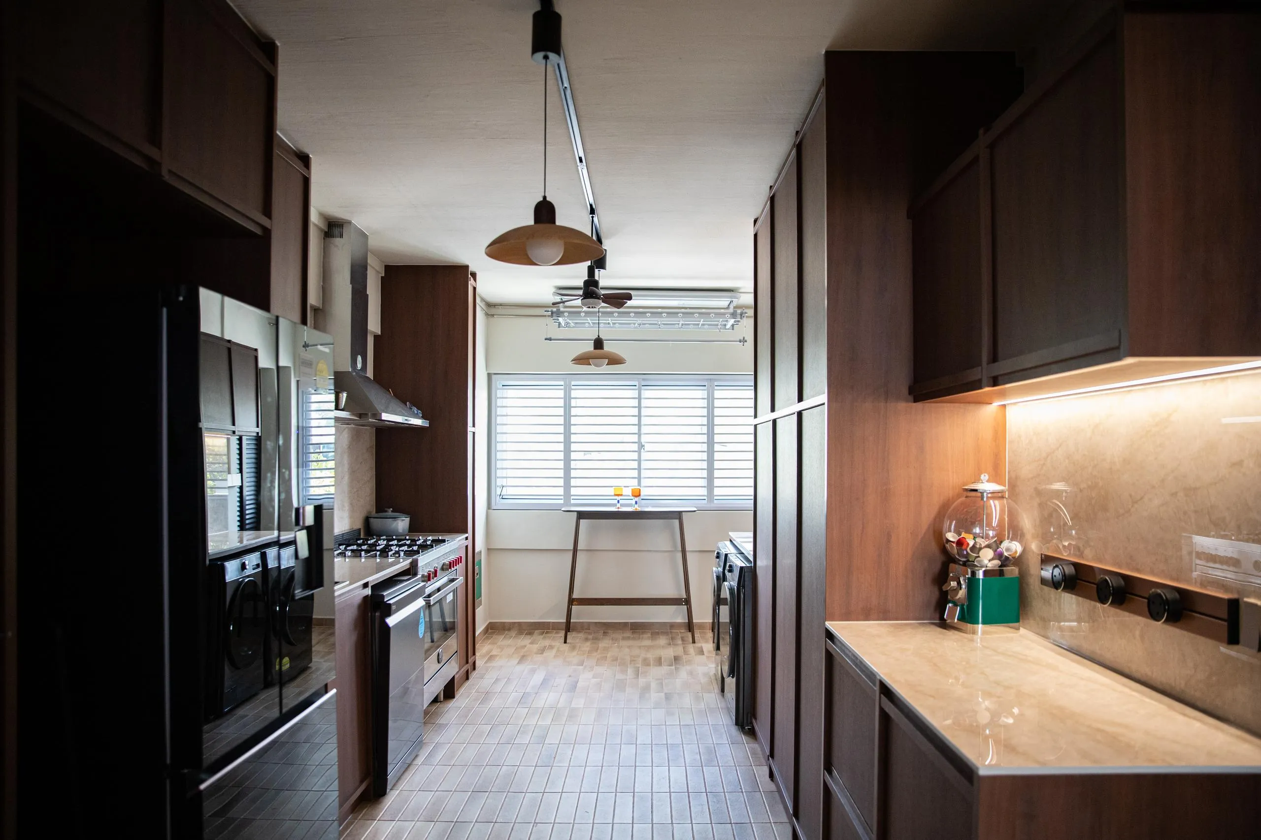 In the kitchen, full-height wood cabinets are custom-built to house built-in appliances, storage, and service areas within a tight galley layout. Accurate measurements and detailed fabrication ensure clean alignment, consistent panel gaps, and a flush finish throughout. The use of woodgrain finishes adds depth while maintaining long-term durability suitable for daily use.