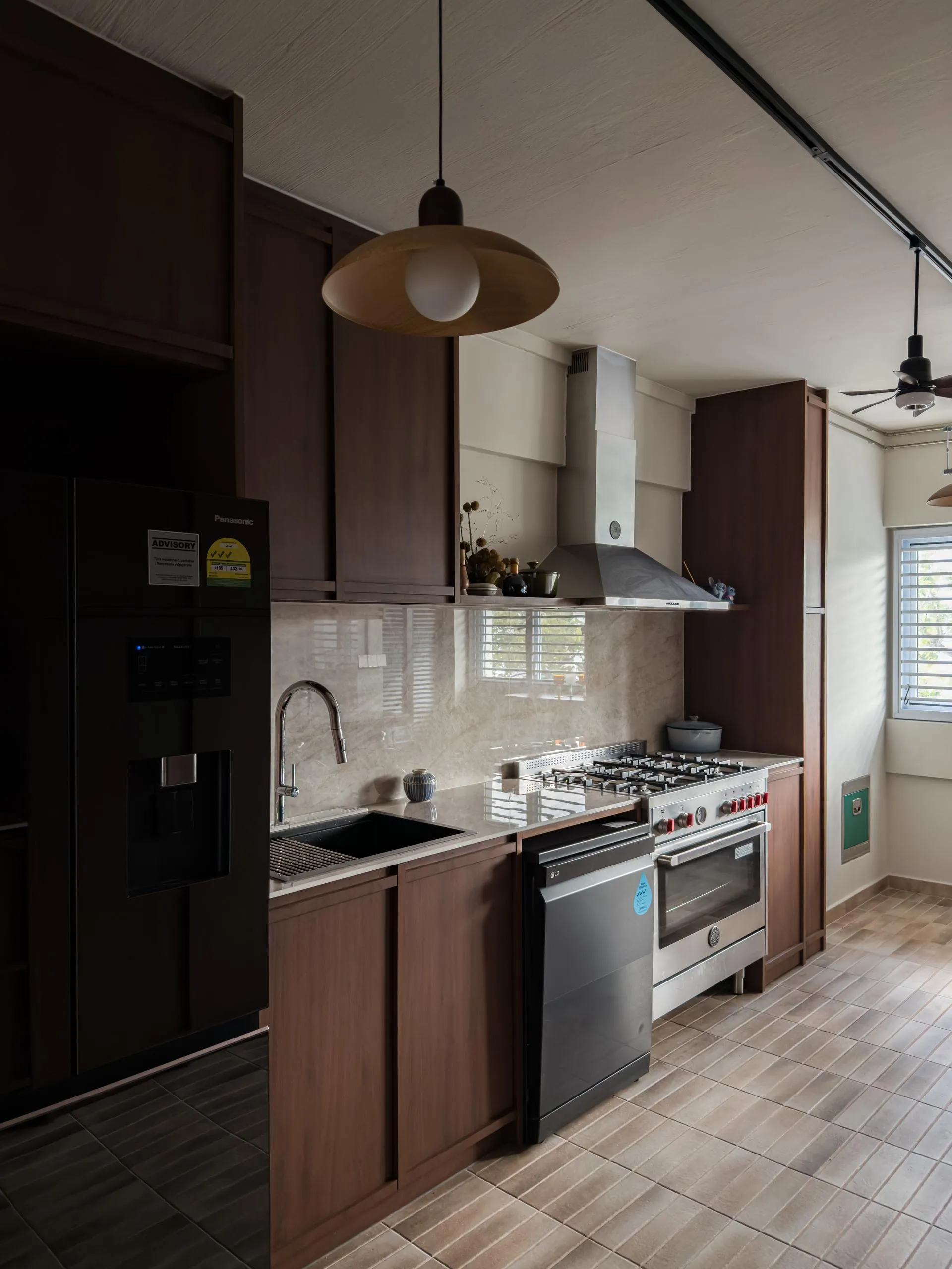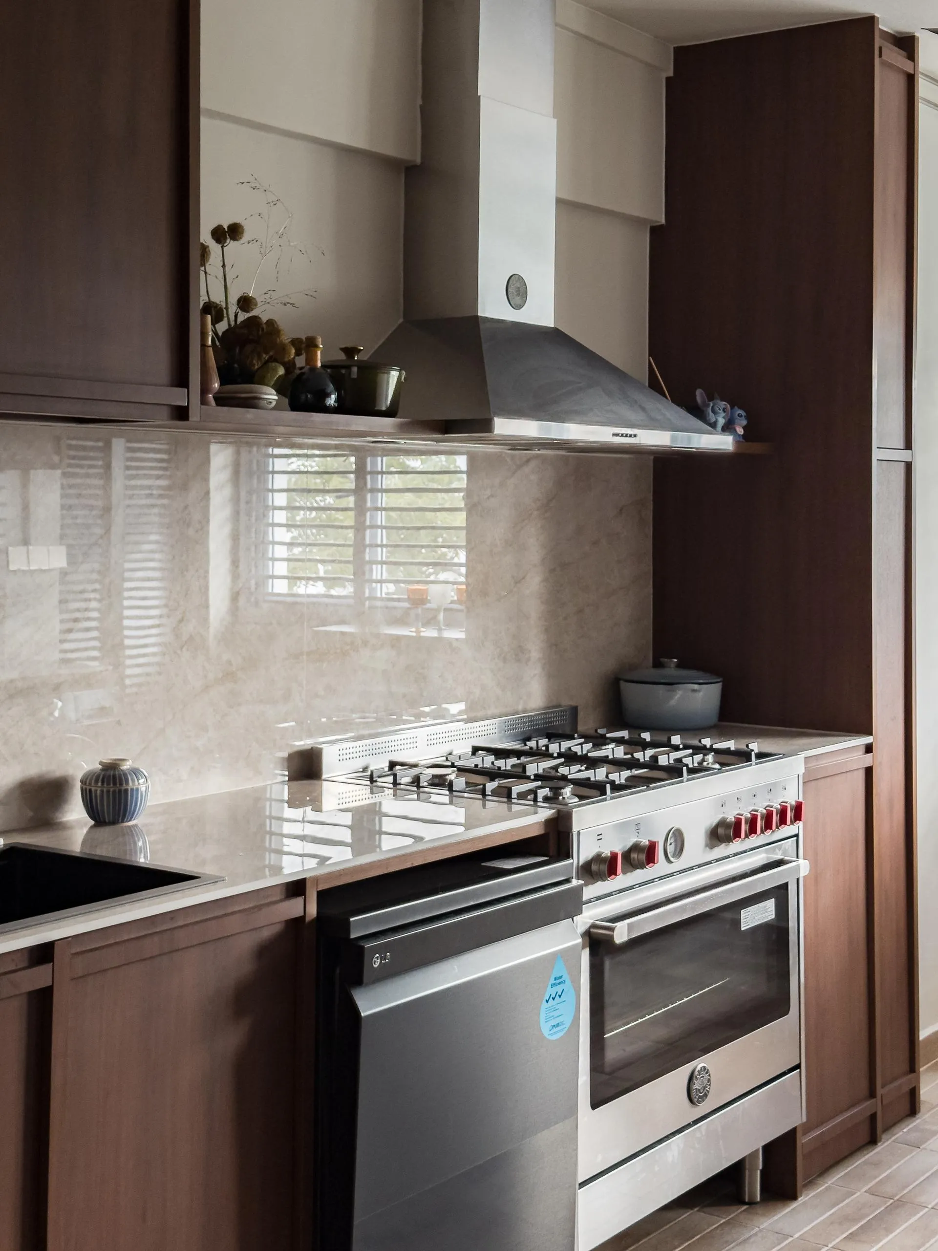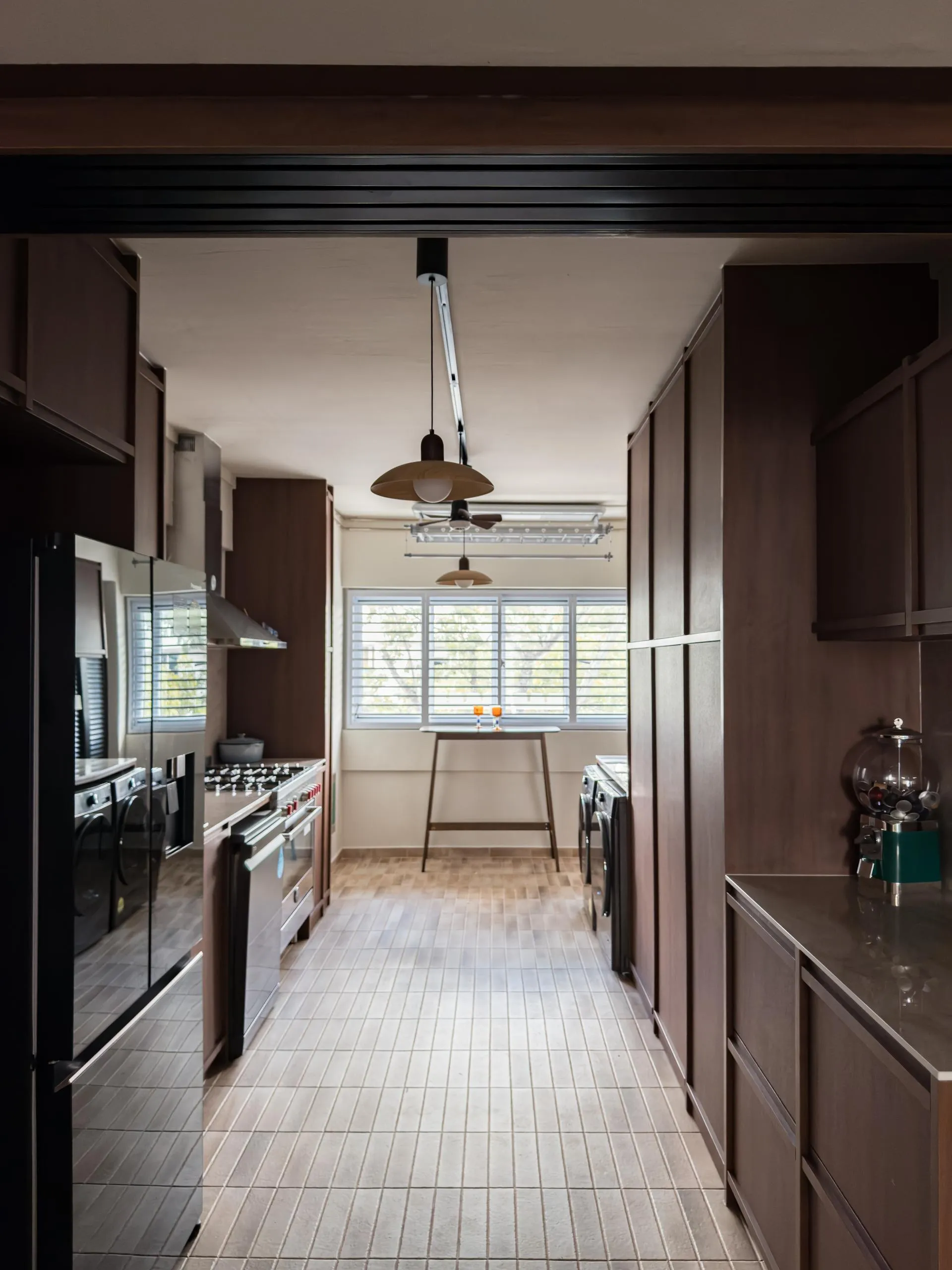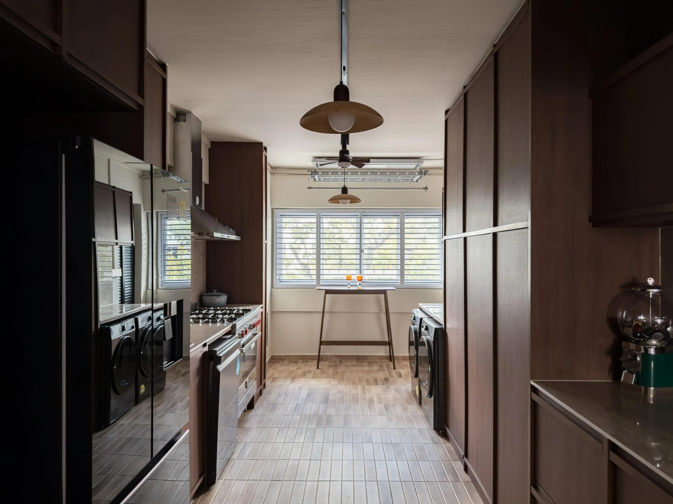 In the kitchen, full-height wood cabinets are custom-built to house built-in appliances, storage, and service areas within a tight galley layout. Accurate measurements and detailed fabrication ensure clean alignment, consistent panel gaps, and a flush finish throughout. The use of woodgrain finishes adds depth while maintaining long-term durability suitable for daily use.