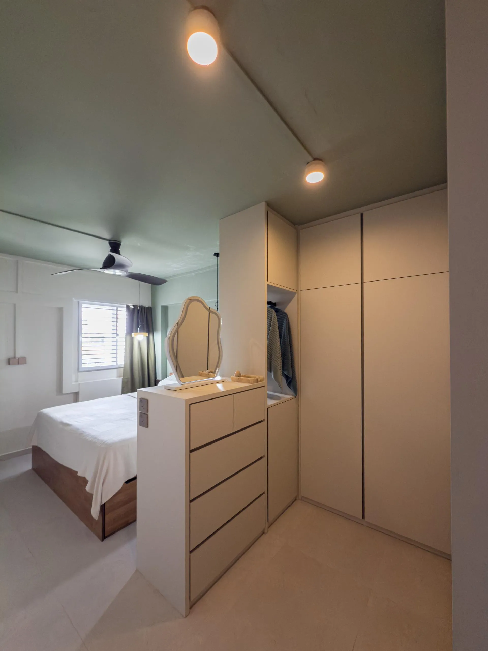 The bedroom carpentry demonstrates efficient space planning through built-in wardrobes and divider cabinets, all fabricated to maximise storage while maintaining accessibility and structural stability. Flush-panel doors, concealed hinges, and integrated compartments reflect careful workmanship and attention to functional detailing. The custom bed platform and surrounding cabinetry are constructed to align precisely with adjoining carpentry, reinforcing continuity and structural balance.